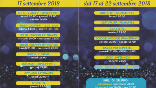 Punta di diamante dell’offerta saranno i corsi di salsa, da sempre motivo di forte interesse e tra i balli più graditi in assoluto. Per ulteriori informazioni, contattare gli istruttori al numero 3388500203 o all’indirizzo claudioemanuela@libero.it.